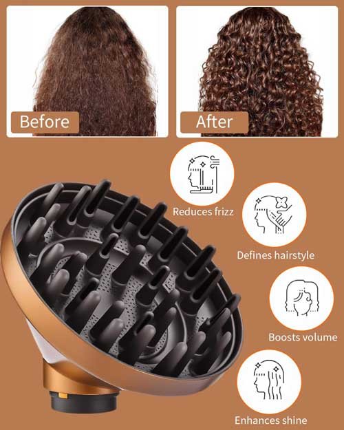 Say goodbye to frizz: unique design of the diffuser provides a frizz-free, voluminous look. Long teeth penetrate deep into hair and distribute air evenly to mimic natural drying and protect hair structure