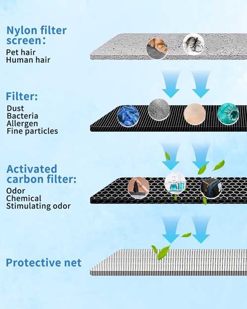 Efficient filter: built-in activated carbon can effectively absorb odours. And it can remove 99.97% of air particles with a diameter of up to 0.3 microns and filter small air particles such as pet hair, dust mites and pollen, which helps remove pollutants and purify the air